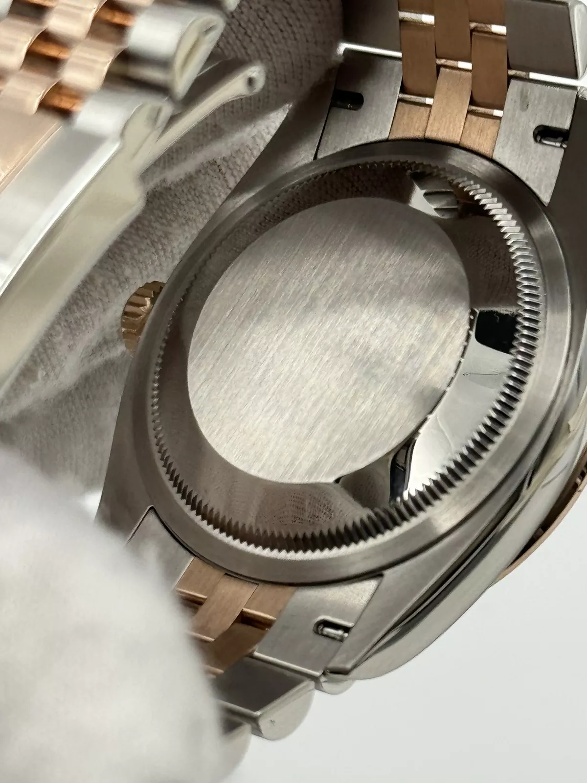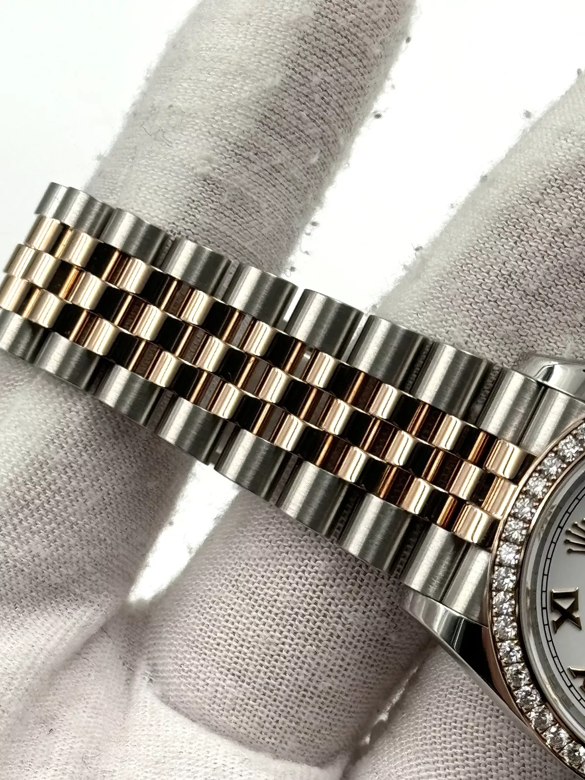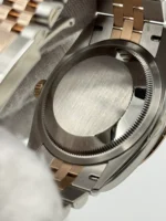 The 36mm Oystersteel and Everose gold case exudes a balanced elegance, making it suitable for both formal and everyday wear. The bezel is set with diamonds, adding a subtle sparkle that elevates the watch without overpowering its classic design. The watch is fitted with a scratch-resistant sapphire crystal, complete with the iconic Cyclops lens over the date window at 3 o’clock, ensuring durability and easy readability.
