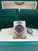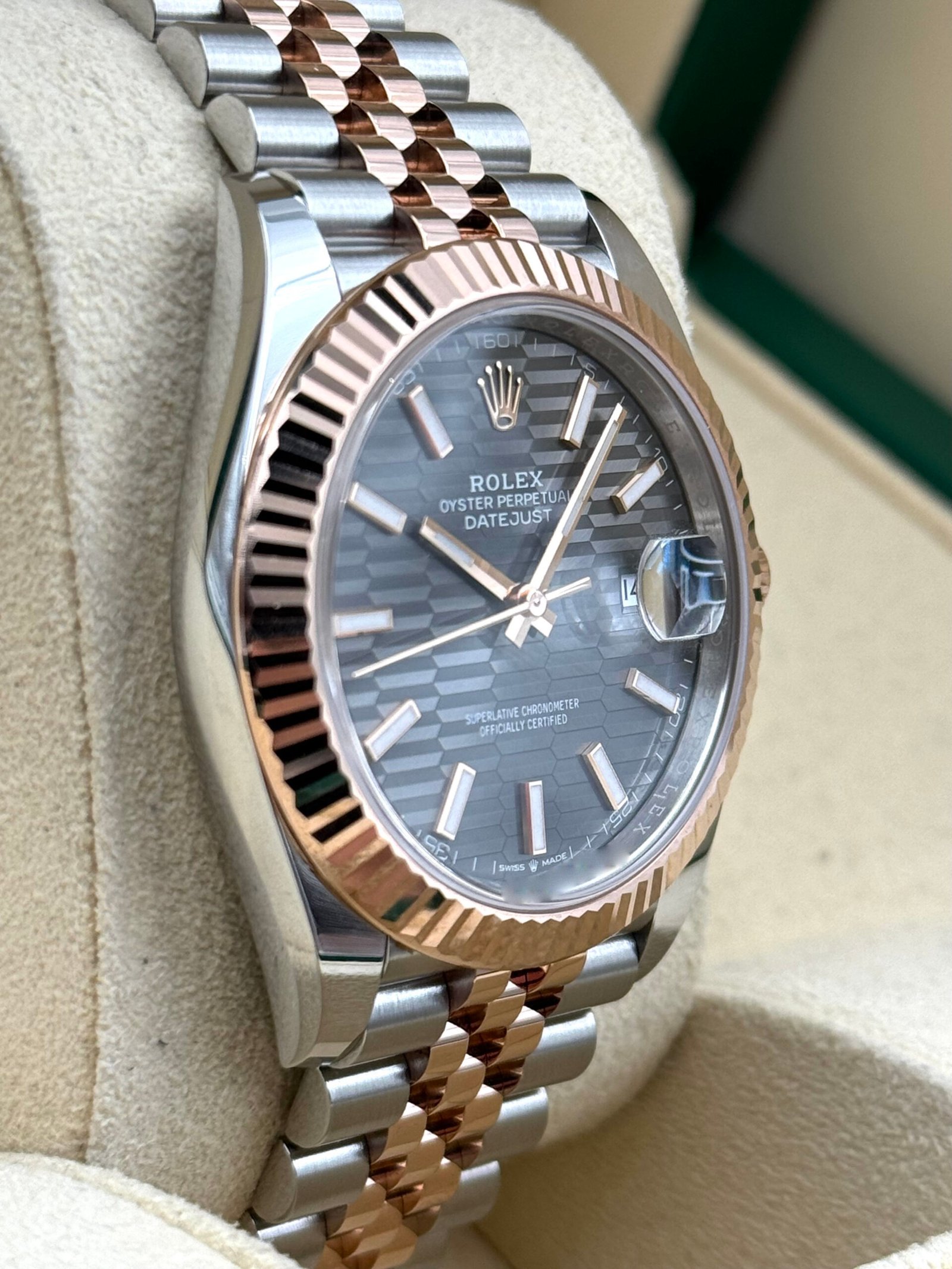 Introducing the Rolex Datejust 41 126331 (Year: 2023) – a testament to timeless design and precision. This piece features a grey dial, two tone rose gold/stainless steel bracelet, and 41 mm steel case, making it a statement piece that effortlessly captures attention.