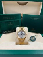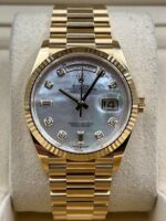 Introducing the Rolex Day-Date 128238 (Year: 2023) – a testament to timeless design and precision. This piece features a mother of pearl dial, yellow gold bracelet, and 36 mm yellow gold case, making it a statement piece that effortlessly captures attention.