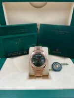 Introducing the Rolex Day-Date 228235 (Year: 2024) – a testament to timeless design and precision. This piece features a green dial, rose gold bracelet, and 40 mm rose gold case, making it a statement piece that effortlessly captures attention.