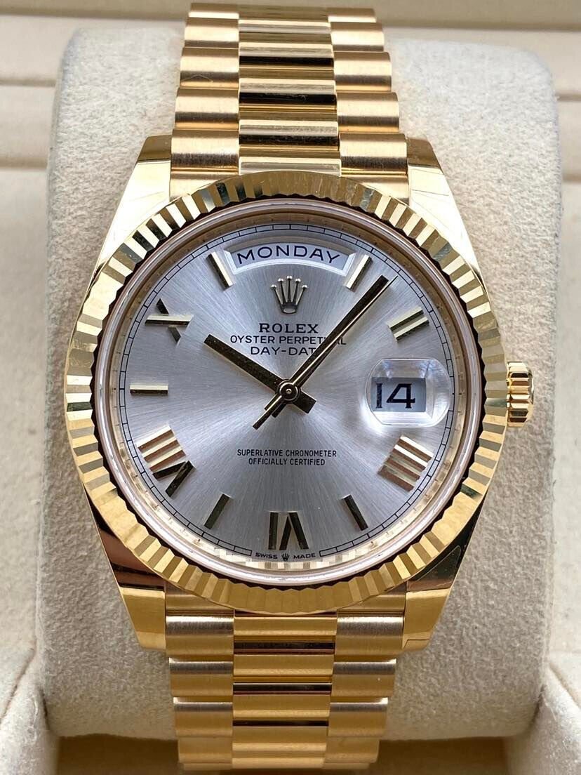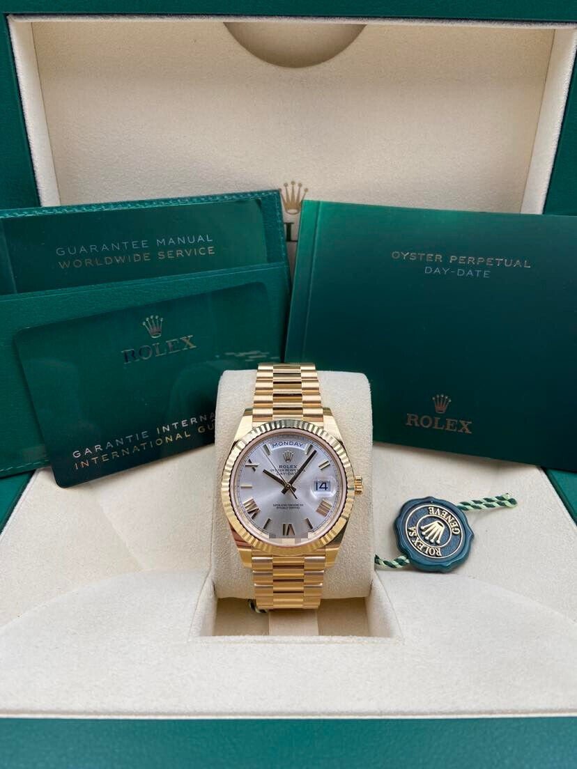 Introducing the Rolex Day-Date 228238 (Year: 2023) – a testament to timeless design and precision. This piece features a silver dial, yellow gold bracelet, and 40 mm yellow gold case, making it a statement piece that effortlessly captures attention.