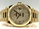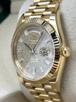 The Rolex Day-Date 40 Reference 228238 with pavé diamond dial is a true symbol of prestige, combining exquisite design, exceptional craftsmanship, and advanced technology. It is the perfect choice for those who demand unparalleled luxury and timeless style.