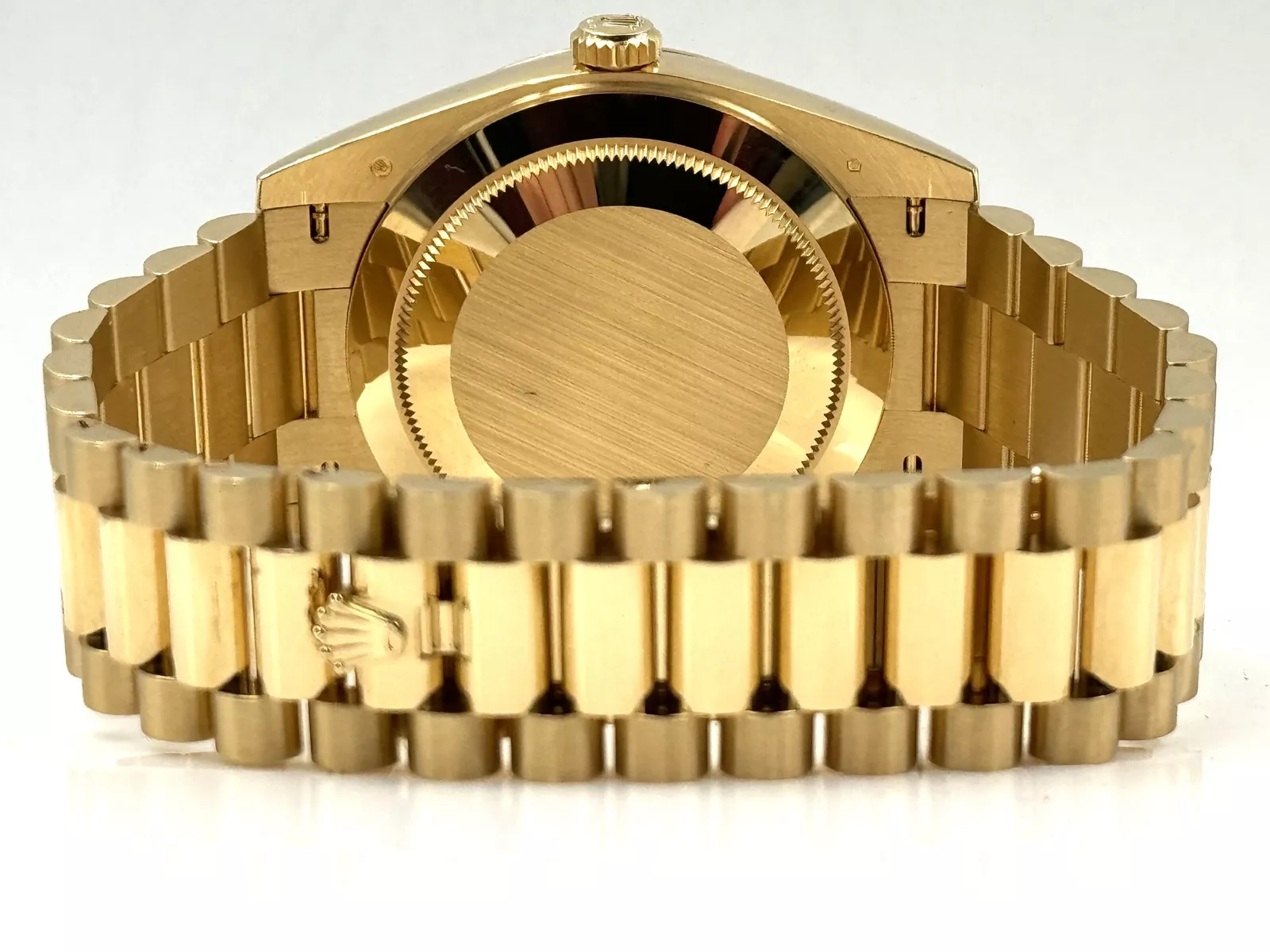 The watch is paired with the President bracelet, crafted from 18k yellow gold and featuring semi-circular three-piece links for ultimate comfort and elegance. The concealed Crownclasp adds a seamless and sophisticated finish, reflecting Rolex’s attention to detail.