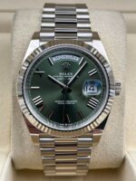 Introducing the Rolex Day-Date 228239 (Year: 2023) – a testament to timeless design and precision. This piece features a green dial, white gold bracelet, and 40 mm white gold case, making it a statement piece that effortlessly captures attention.