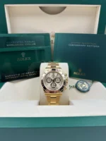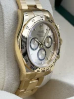 The 40mm case is crafted entirely from 18k yellow gold, giving the watch a striking presence on the wrist. Its polished finish and classic proportions reflect the Daytona’s origins as a racing chronograph while adding a touch of opulence. The fixed yellow gold bezel features an engraved tachymeter scale, allowing wearers to measure speeds up to 400 units per hour—a nod to the Daytona’s racing legacy.