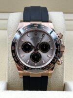 The 40mm Everose gold case is complemented by a scratch-resistant sundust Cerachrom bezel with an engraved tachymeter scale, ideal for measuring average speeds—an homage to the Daytona’s racing heritage. The Cerachrom bezel not only enhances the watch’s sporty appeal but also offers lasting durability, keeping it pristine even after years of wear.