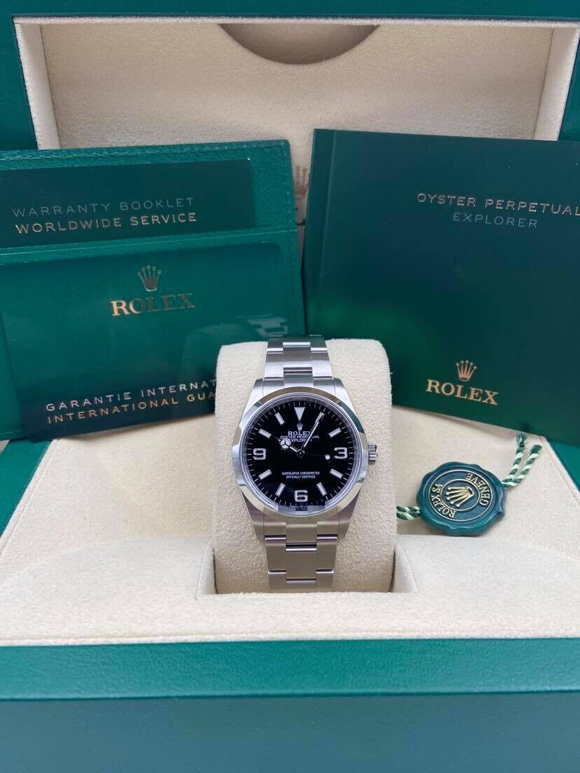 Introducing the Rolex Explorer I 124270 (Year: 2024) – a testament to timeless design and precision. This piece features a black dial, steel bracelet, and 36 mm steel case, making it a statement piece that effortlessly captures attention.