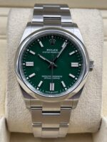 Introducing the Rolex Oyster Perpetual 126000 (Year: 2024) – a testament to timeless design and precision. This piece features a green dial, steel bracelet, and 36 mm steel case, making it a statement piece that effortlessly captures attention.