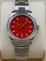 Introducing the Rolex Oyster Perpetual 277200 (Year: 2020) – a testament to timeless design and precision. This piece features a red dial, steel bracelet, and 31 mm steel case, making it a statement piece that effortlessly captures attention.