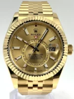 The Rolex Sky-Dweller 336938 with a champagne dial and Jubilee bracelet is the perfect fusion of luxury and innovation, tailored for discerning travelers. Crafted in 18k yellow gold and featuring Rolex’s most advanced dual-time functionality and annual calendar, this timepiece offers a harmonious blend of sophistication and practicality.